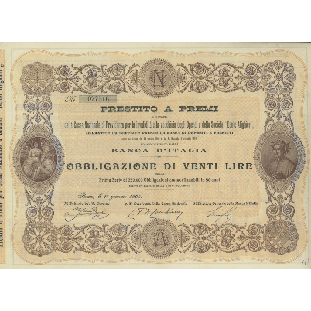 OBBLIGAZIONE DA 20 LIRE PER: PRESTITO A PREMI DELLA CASSA NAZIONALE DI PREVIDENZA PER LA INVALIDITA' E LA VECCHIAIA DEGLI OPERAI E DELLA SOCIETA' DANTE ALIGHIERI