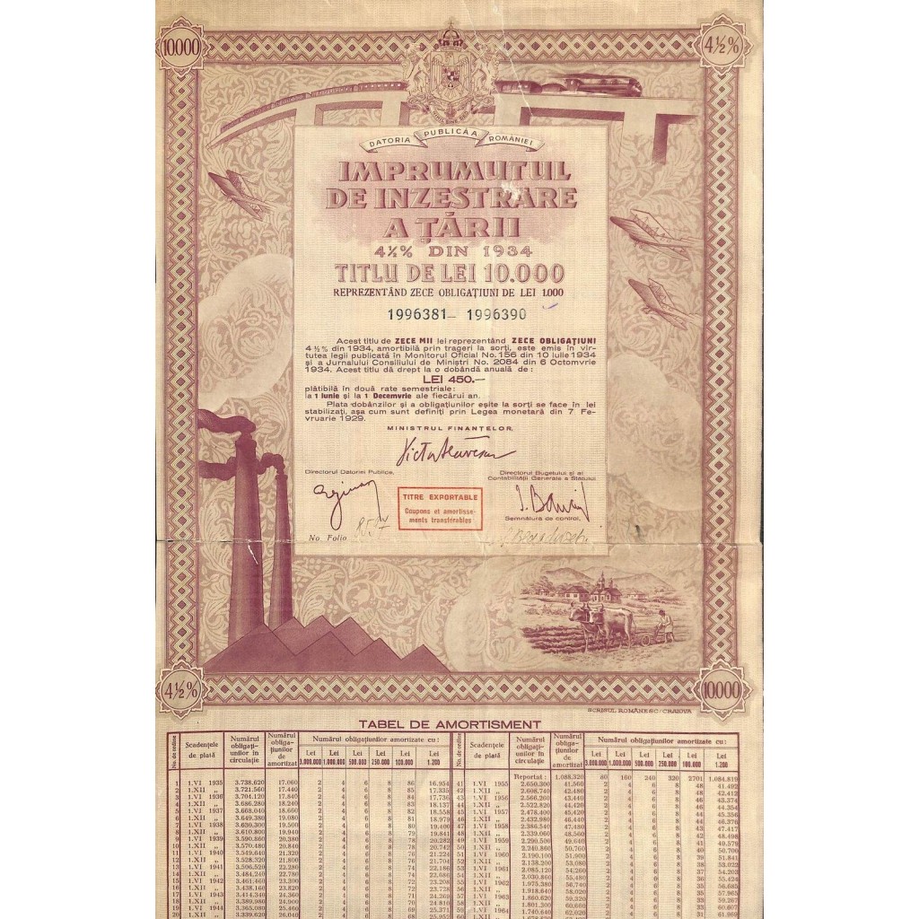 Titolo di 10 obbligazioni del valore di 10000 lei.
