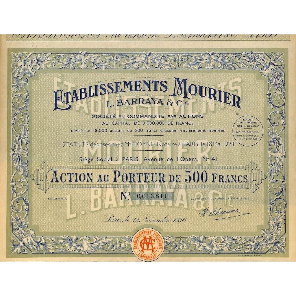 1936 - ETABLISSEMENTS MOURIER - L. BARRAYA E C. (CAP. SOC. 9.000.000 DI FR.)
