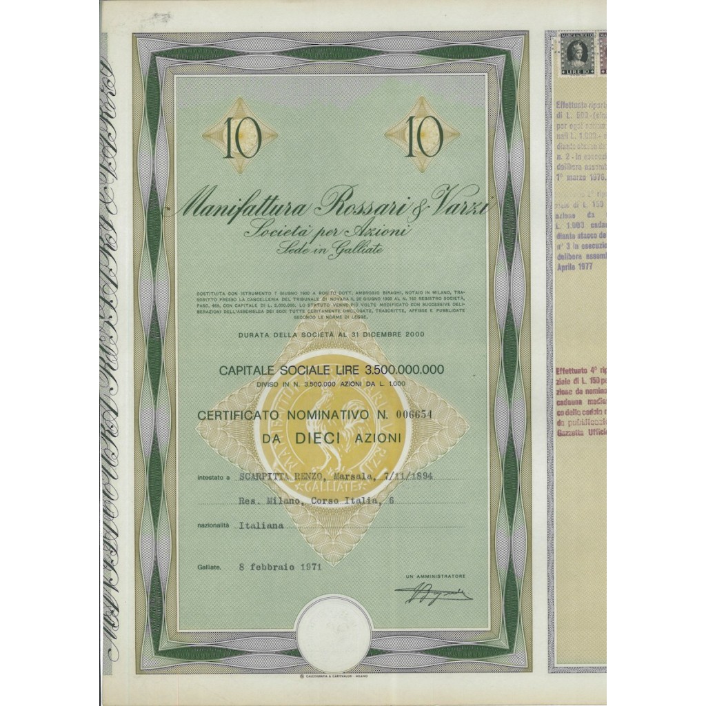 Titolo: Manifattura Rossari & Varzi - Certificato Nominativo di 10 Azioni - Galliate, 1971