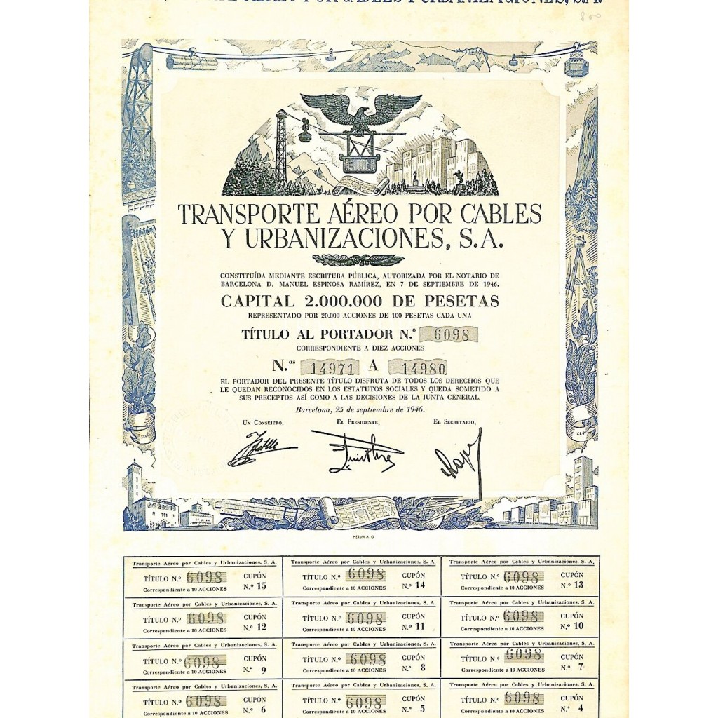 Titolo di dieci azioni al portatore del valore di 100 Pesetas cadauna.