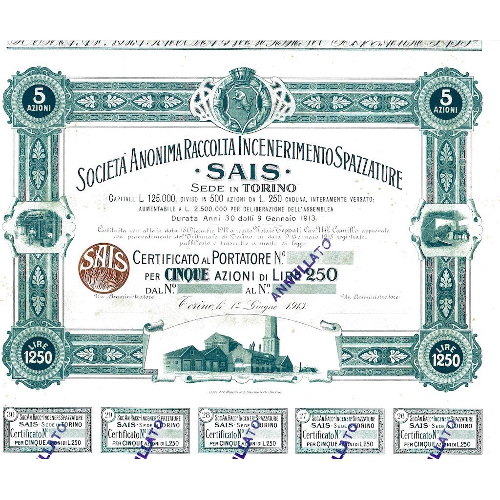 Certificato al portatore per 5 azioni del valore di Lire 250 ciascuna.