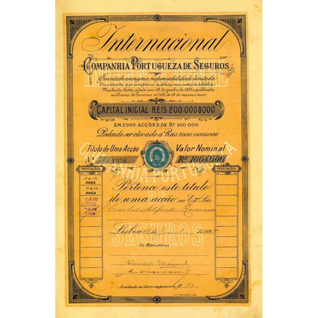 La "Internacional Companhia Portugeza de Seguros" è una società di assicurazioni portoghese costituita nel 1895, come indicato dal documento che rappresenta un titolo azionario dell'epoca. Il capitale iniziale della società era di 200.000.000 réis, suddiviso in 2000 azioni dal valore nominale di 100.000 réis ciascuna, con possibilità di aumento fino a 1.000.000.000 réis.