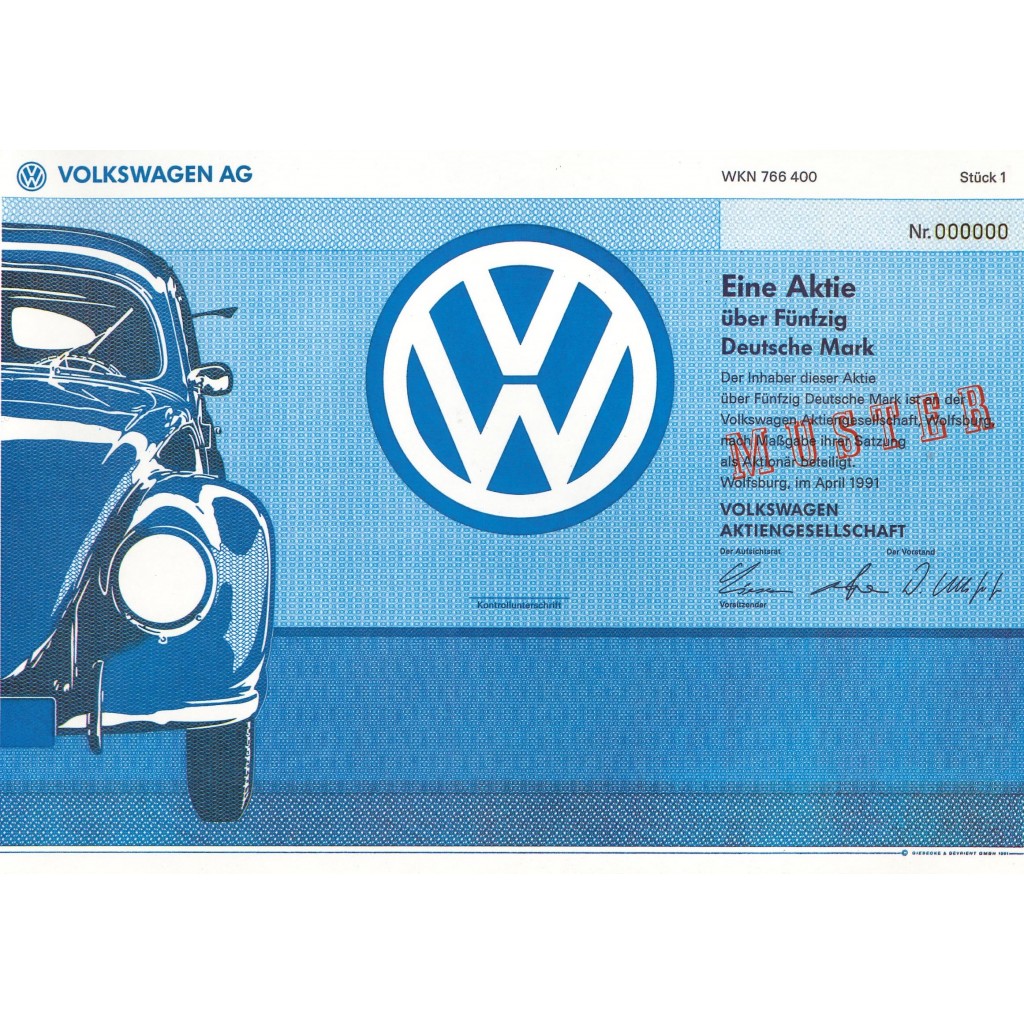 Il documento in questione è un titolo storico della Volkswagen del 1991, denominato in Deutsche Mark (DM). Le caratteristiche principali sono: