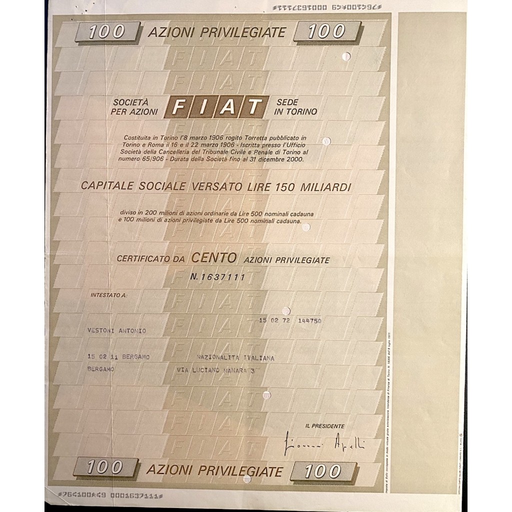 Titolo al portatore di 2 azioni privilegiate da 500 Lire ciascuna. La FIAT (nata come acronimo di Fabbrica Italiana Automobili Torino), ora nota come Fiat Automobiles, è stata fondata l'11 luglio 1899 a Torino come casa produttrice di automobili, per poi sviluppare la propria attività in numerosi altri settori, dando vita al più importante gruppo finanziario e industriale privato italiano. Ora fa parte, insieme ai marchi Alfa Romeo, Lancia, Abarth & C. e Fiat Professional, di Fiat Group Automobiles (abbreviato in FGA) che rappresenta una delle diramazioni del gruppo industriale Fiat SpA.
