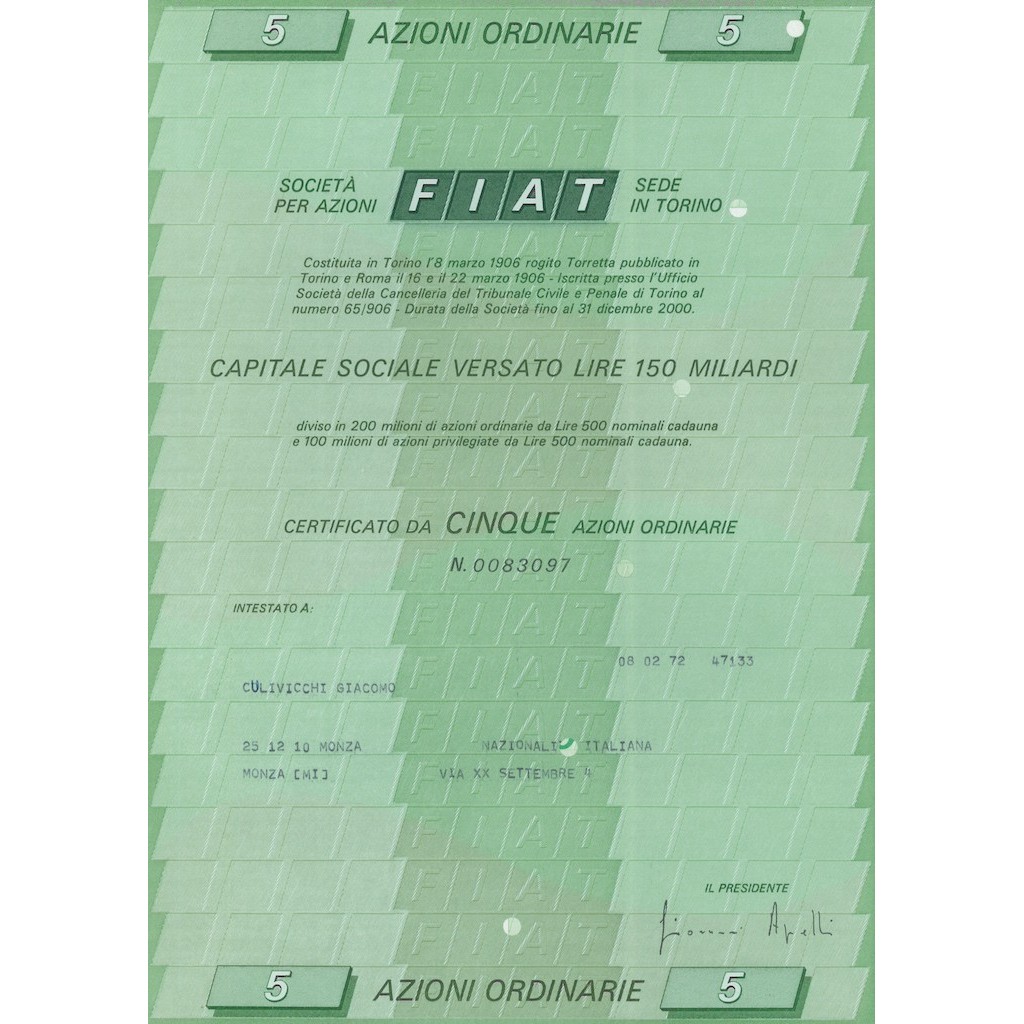 Titolo al portatore di 5 azioni ordinarie da 500 Lire ciascuna. La FIAT (nata come acronimo di Fabbrica Italiana Automobili Torino), ora nota come Fiat Automobiles, è stata fondata l'11 luglio 1899 a Torino come casa produttrice di automobili, per poi sviluppare la propria attività in numerosi altri settori, dando vita al più importante gruppo finanziario e industriale privato italiano. Ora fa parte, insieme ai marchi Alfa Romeo, Lancia, Abarth & C. e Fiat Professional, di Fiat Group Automobiles (abbreviato in FGA) che rappresenta una delle diramazioni del gruppo industriale Fiat SpA.