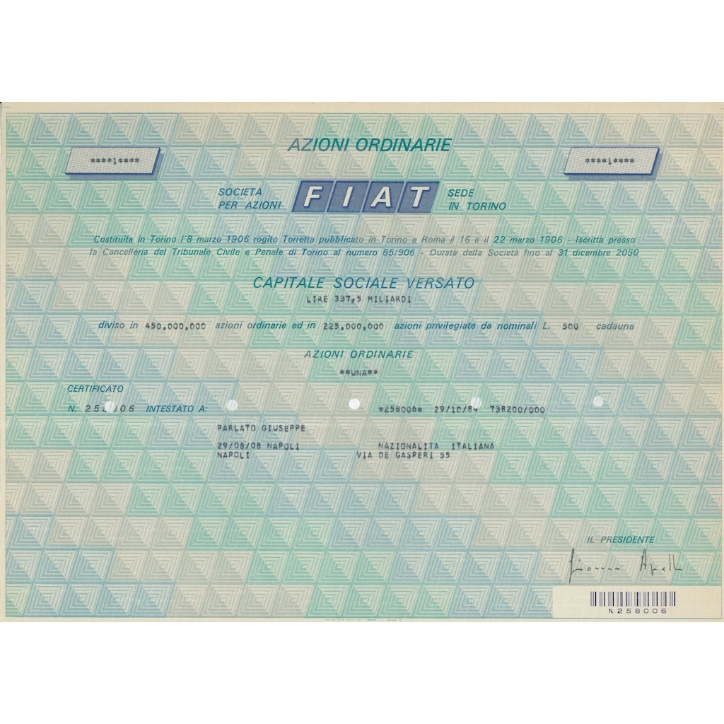 Certificato azionario originale della FIAT, la leggendaria casa automobilistica e industriale italiana. Questo documento rappresenta azioni ordinarie della società, emesse con un valore nominale di 500 Lire ciascuna.