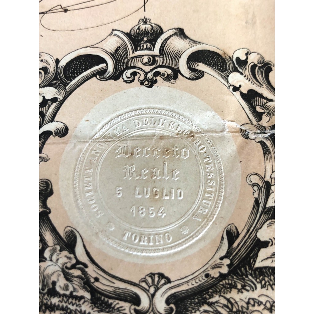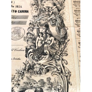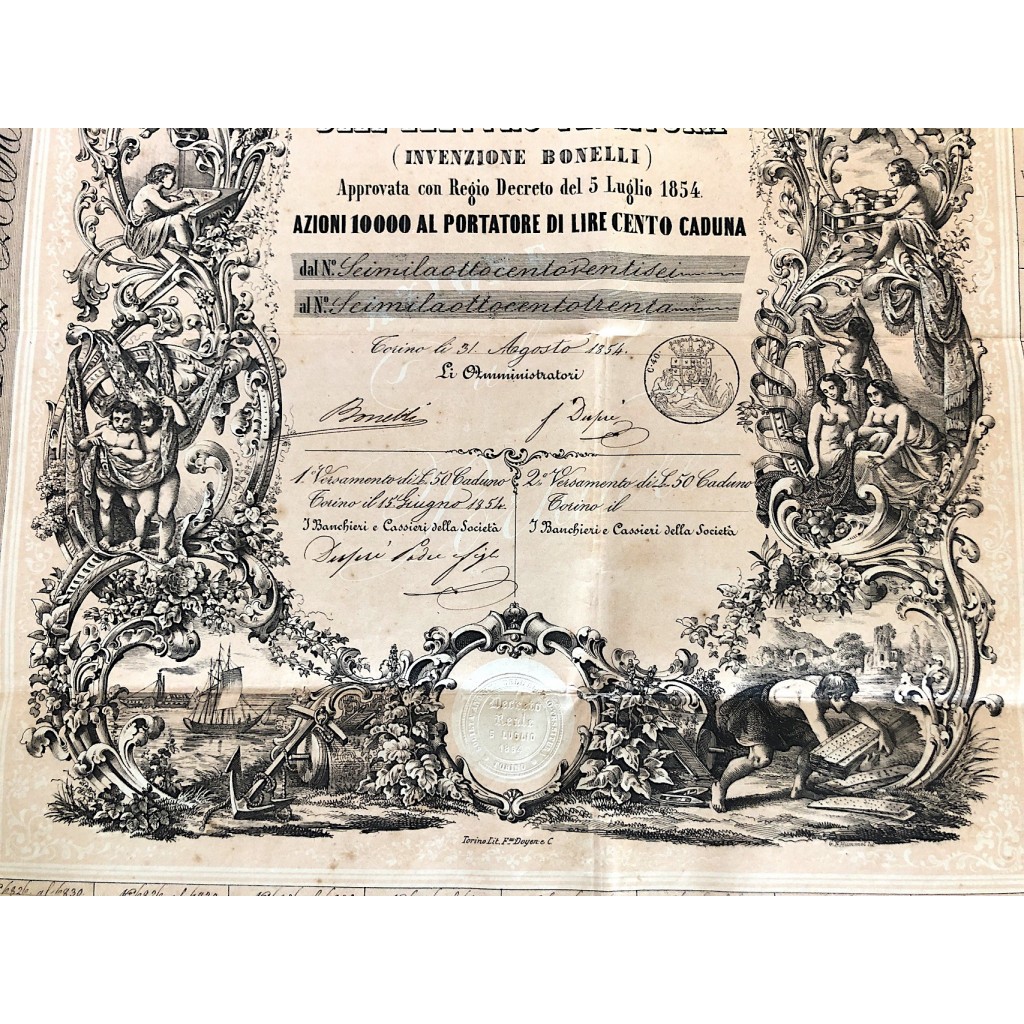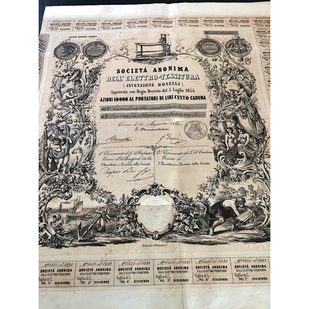 Un documento corredato da stupende allegorie simboleggianti gli obiettivi sociali. Oggi parliamo di un titolo al portatore da 1 azione da 100 Lire Torino, emanato il 31 agosto 1854, dalla Società Anonima dell’Elettro – Tessitura (Invenzione Bonelli). Gaetano Bonelli, a capo dell’omonima società, crea la società per applicare nel settore tessile industriale la sua invenzione. Ovvero l’applicazione dell’elettricità come forza regolatrice ai famosi telai Jacquard mediante l’impiego di una guida elettro-magnetica e la sostituzione della messa in cartoni con l’armatura in licci, nell’intento di semplificarne il meccanismo. L’energia elettrica viene così fornita da batterie poiché l’elettricità via cavo non è ancora disponibile. Una scoperta che viene accolta con clamore dal mondo tessile industriale che, già all’inizio dell’Ottocento, grazie all’introduzione delle prime macchine tessili e in particolare dei filatoi automatici, detti mule, a opera di Pietro Sella (1784-1827), subisce una repentina trasformazione. L’affermarsi delle nuove tecnologie e delle prime fabbriche tessili, porta la progressiva suddivisione e specializzazione del lavoro, determinando da un canto la formazione di nuovi profili professionali all’interno del sistema di fabbrica e rafforzando dall’altro il ceto dei tessitori a domicilio. Nei decenni successivi, alle storiche dinastie tessili di origine manifatturiera, si affiancano imprenditori di origine operaia che danno nuovo slancio alla produzione. A metà Ottocento si registra così un netto incremento produttivo.