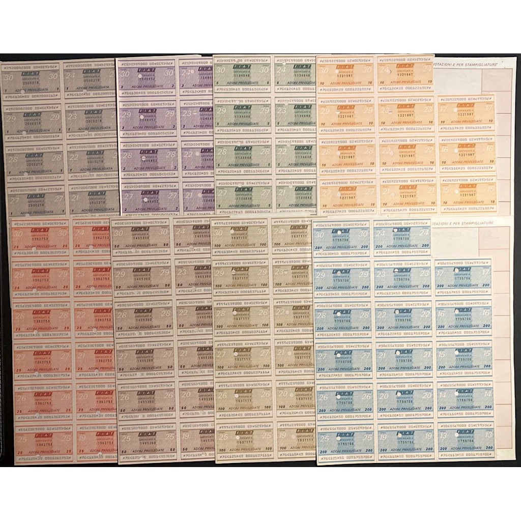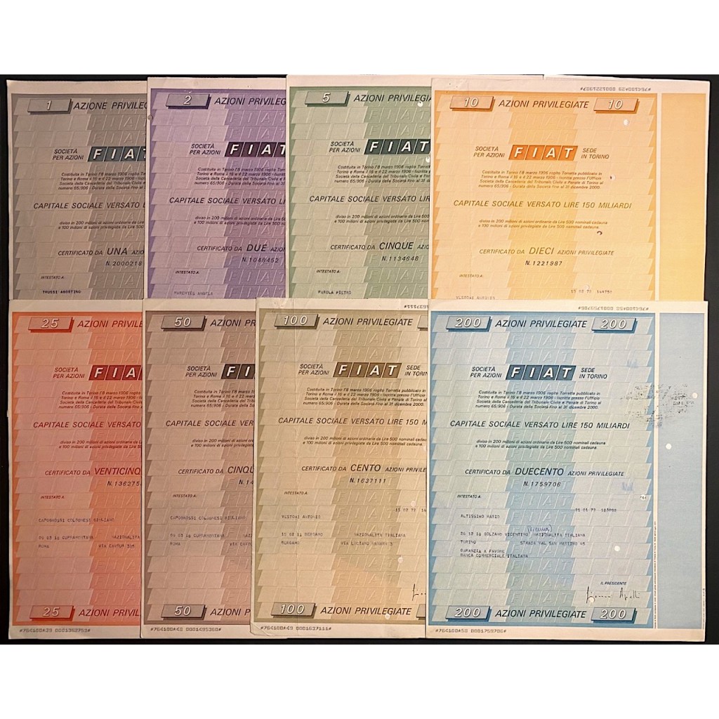 Titolo al portatore di ben 8 azioni fiat con le relative cedole nella serie da 1 a 200 azioni. La FIAT (nata come acronimo di Fabbrica Italiana Automobili Torino), ora nota come Fiat Automobiles, è stata fondata l'11 luglio 1899 a Torino come casa produttrice di automobili, per poi sviluppare la propria attività in numerosi altri settori, dando vita al più importante gruppo finanziario e industriale privato italiano. Ora fa parte, insieme ai marchi Alfa Romeo, Lancia, Abarth & C. e Fiat Professional, di Fiat Group Automobiles (abbreviato in FGA) che rappresenta una delle diramazioni del gruppo industriale Fiat SpA.