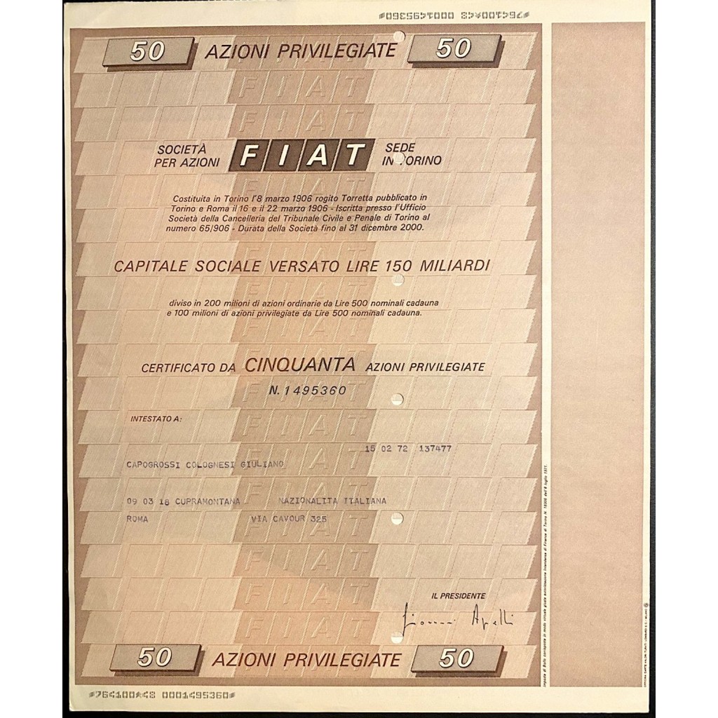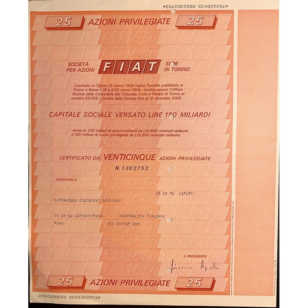 Storica e rara azione della FIAT da collezione