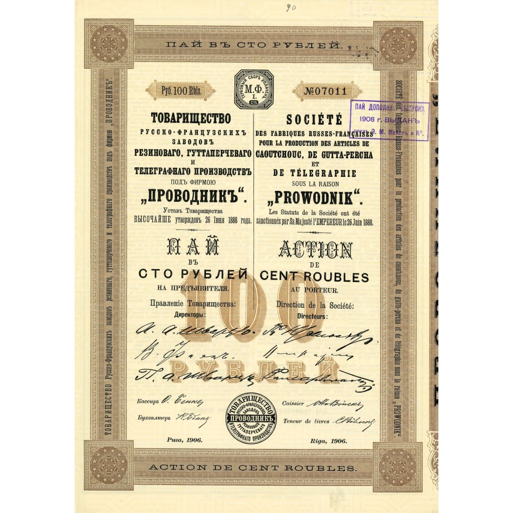 La "Société des Fabriques Russes-Françaises pour la Production des Articles de Caoutchouc, de Gutta-Percha et de Télégraphie sous la Raison Prowodnik" è stata una delle principali società industriali attive nella produzione di articoli in gomma, guttaperca e materiale per telegrafia nell'Impero Russo. Fondata nel 1888, la società ha giocato un ruolo cruciale nell'industrializzazione del settore della gomma e delle telecomunicazioni, contribuendo significativamente allo sviluppo economico dell'epoca.