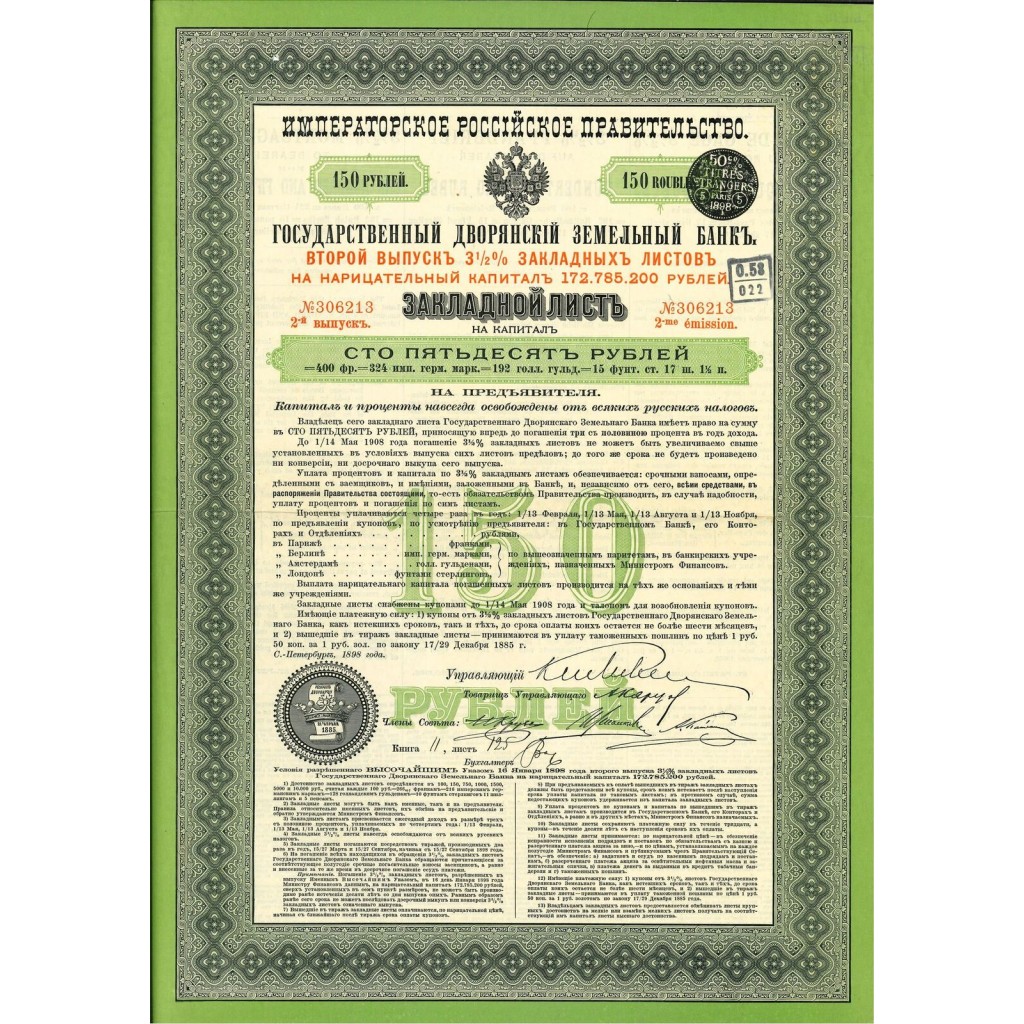 Il documento che hai di fronte è un'obbligazione emessa dal "Gosudarstvennyy Dvoryanskiy Zemel'nyy Bank" (Banca Statale Nobiliare Fondiaria) dell'Impero Russo nel 1898. Questo titolo, parte di un'emissione più ampia, rappresenta una garanzia di capitale su proprietà terriere e aveva un valore nominale di 150 rubli. Il tasso d'interesse offerto era del 3½%, riflettendo l'obiettivo della banca di attirare investitori per finanziare le operazioni agricole e di gestione delle proprietà della nobiltà russa.