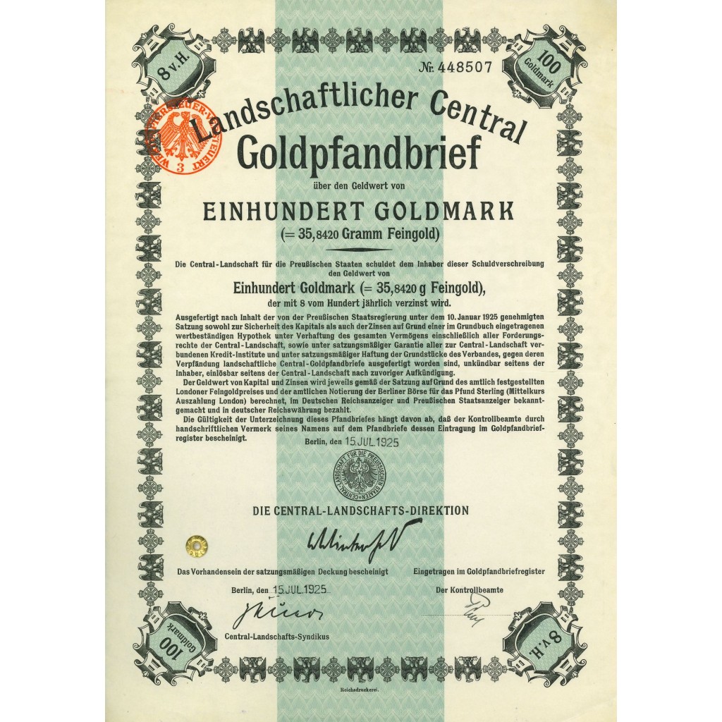 La Central-Landschaft, conosciuta ufficialmente come "Die Central-Landschaft für die Preußischen Staaten," è un'istituzione storica con radici profonde nella gestione dei prestiti agricoli e delle obbligazioni garantite in oro. Fondata con l'obiettivo di sostenere gli agricoltori prussiani, la Central-Landschaft ha emesso una serie di obbligazioni garantite in oro (Goldpfandbriefe), che rappresentano un pezzo significativo della storia economica tedesca.