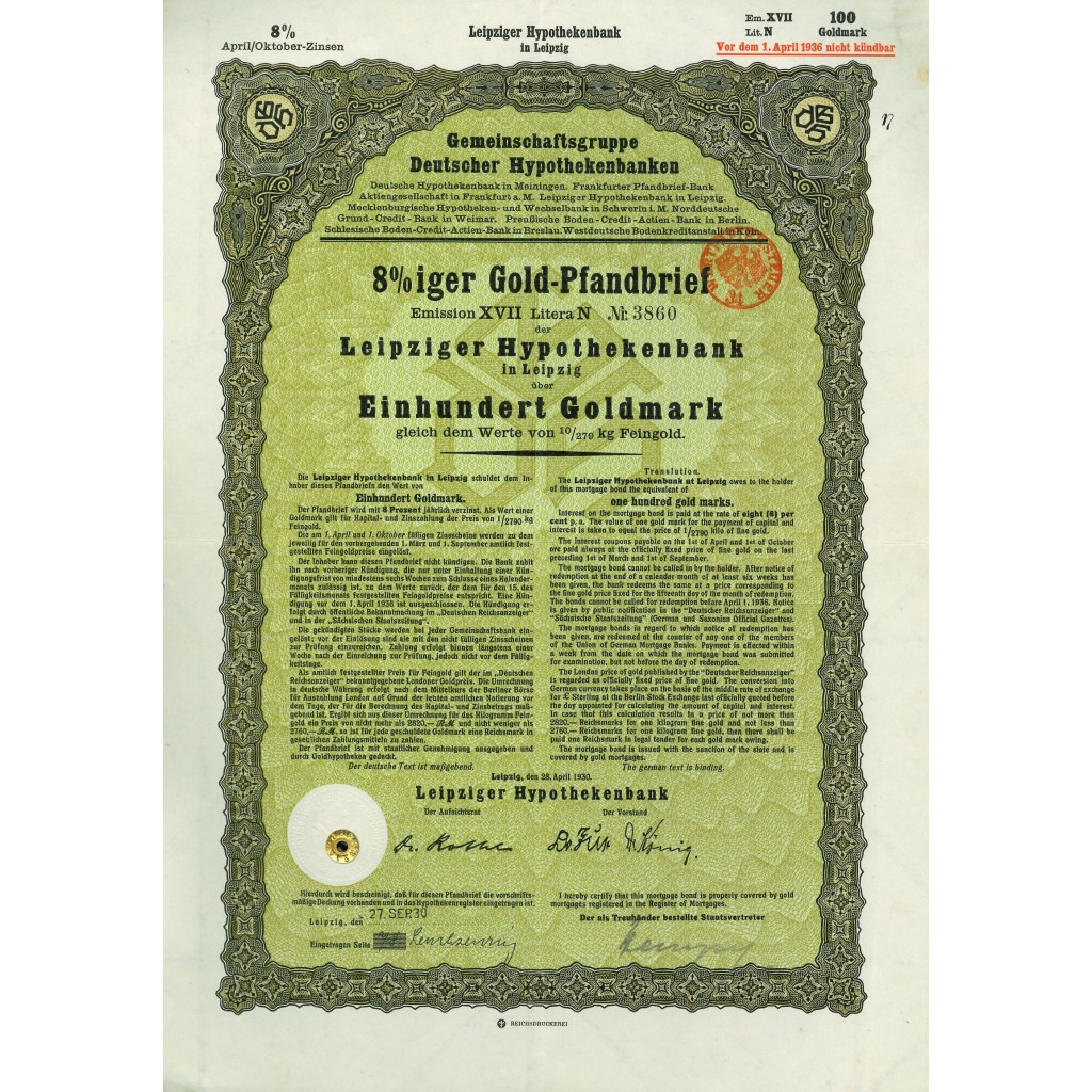 La Leipziger Hypothekenbank è stata conosciuta per l'emissione di obbligazioni ipotecarie, garantite da immobili di alta qualità. Queste obbligazioni, note come "Gold-Pfandbrief", erano molto apprezzate dagli investitori per la loro sicurezza e stabilità. La banca ha operato in un periodo di grande espansione economica e urbanistica in Germania, contribuendo in modo significativo allo sviluppo della città di Lipsia e delle aree circostanti.