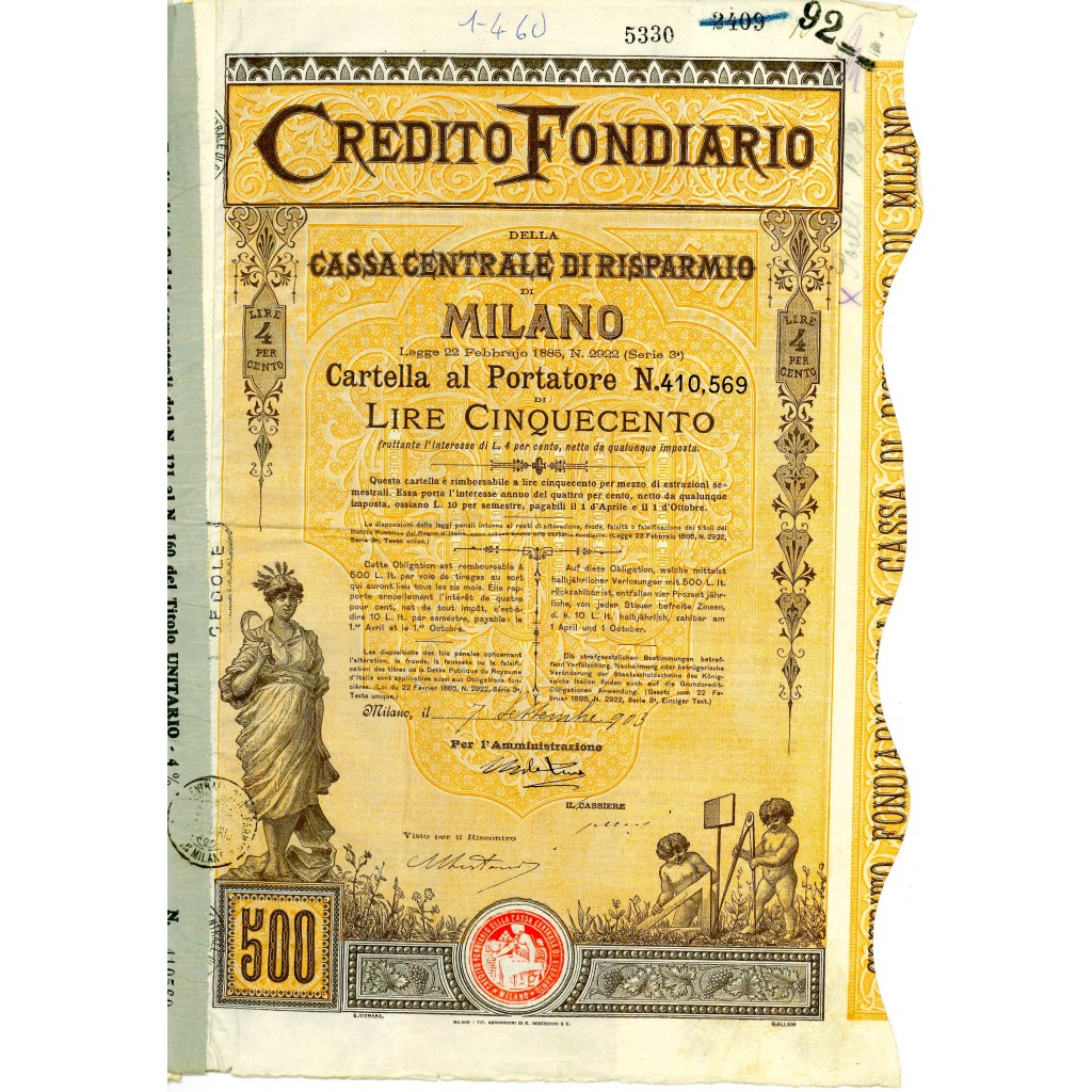 1903 - CREDITO FONDIARIO DELLA CASSA CENTRALE DI RISPARMIO DI MILANO - LIRE 500