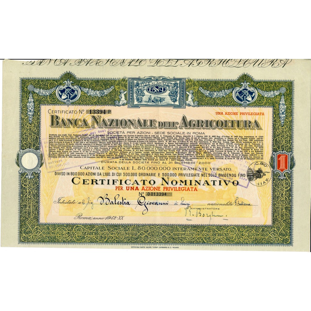 1942 - BANCA NAZIONALE DELL AGRICOLTURA - 1 AZIONI PRIVILEGIATA - ROMA