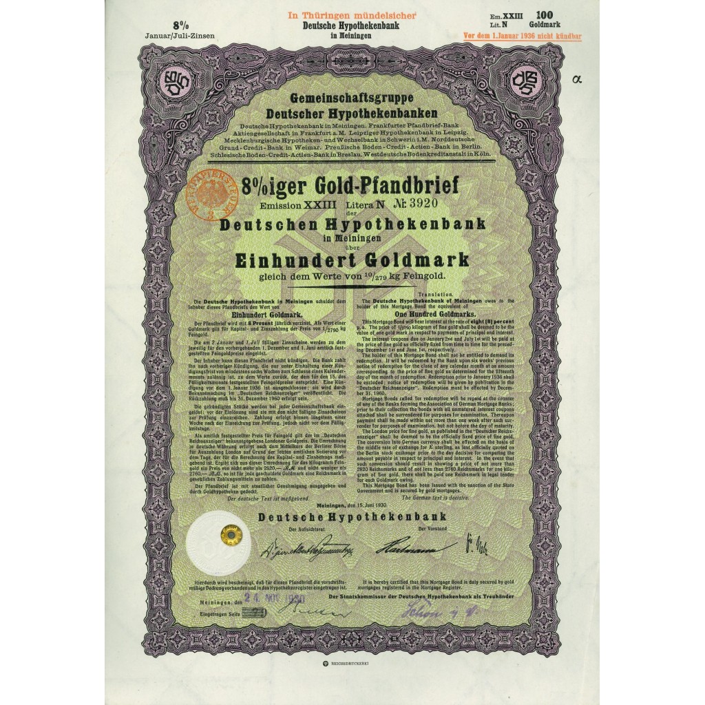 Il documento qui rappresentato è un 8% Gold-Pfandbrief emesso nel 1930, un esempio di come la banca raccogliesse capitali attraverso obbligazioni garantite da ipoteche. Questi titoli erano molto apprezzati dagli investitori per la loro sicurezza e affidabilità, offrendo un rendimento fisso e costante. La Deutsche Hypothekenbank in Meiningen faceva parte di un consorzio di banche ipotecarie tedesche, ampliando così la sua portata e capacità di emissione.