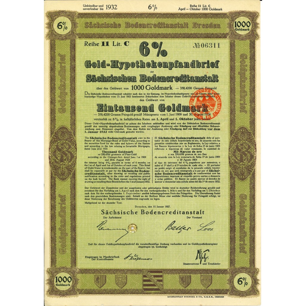 La Sächsische Bodenkreditanstalt di Dresda, costituita il 15 gennaio 1927, era una banca regionale tedesca specializzata nella concessione di prestiti ipotecari. L'istituto finanziava principalmente progetti immobiliari e agricoli tramite l'emissione di obbligazioni garantite da ipoteche su terreni e proprietà immobiliari.