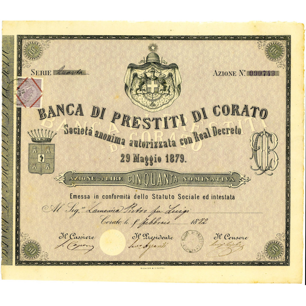 L'emissione di questo certificato azionario avviene in un periodo di crescita economica per l’Italia unificata, durante la quale le banche locali giocavano un ruolo fondamentale nel finanziamento delle attività economiche regionali. La Banca di Prestiti di Corato, come molte altre istituzioni simili, era impegnata a fornire supporto finanziario alle piccole e medie imprese locali, in particolare nel settore agricolo, che rappresentava il cuore pulsante dell'economia del sud Italia.