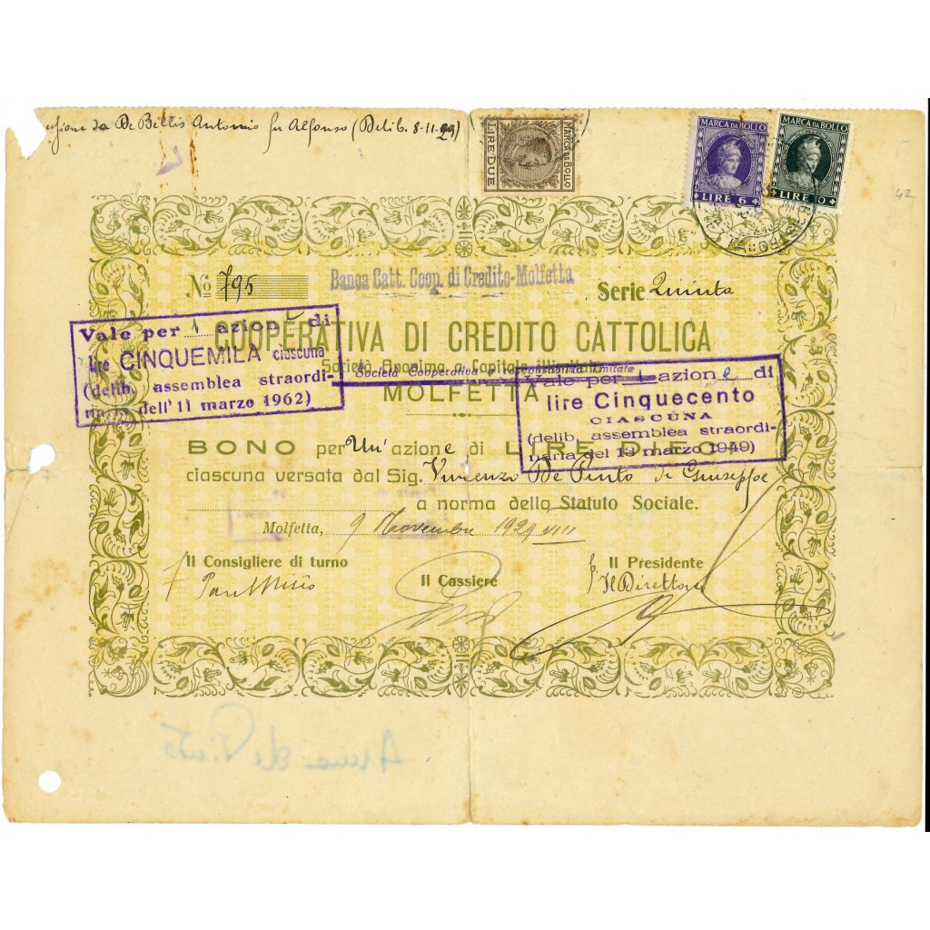 1929 - BANCA CATTOLICA COOPERATIVA DI CREDITO MOLFETTA BONO 1 AZIONE Lire 10
