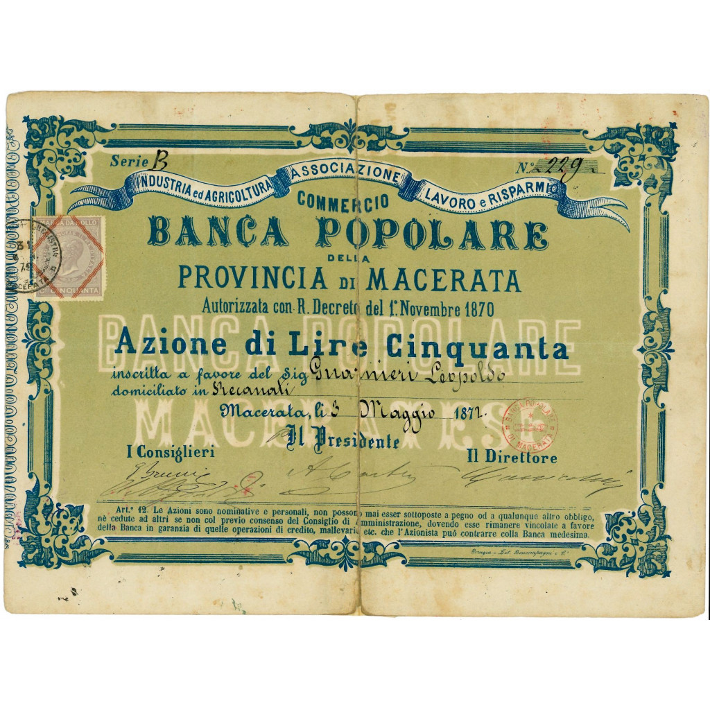 1872 - BANCA POPOLARE DELLA PROVINCIA DI MACERATA - 1 AZIONE