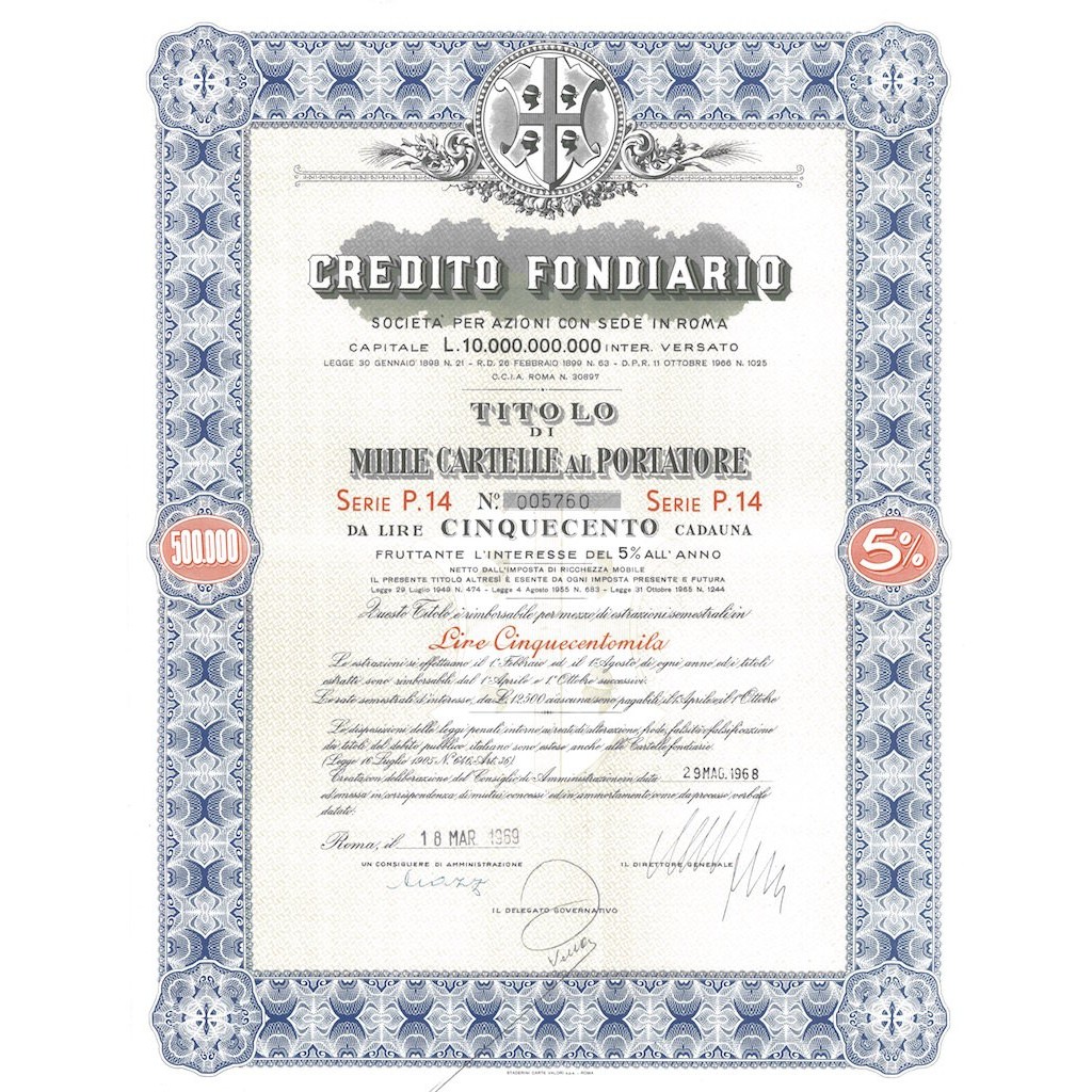 TITOLO DI MILLE CARTELLE AL PORTATORE DA LIRE 500 CADAUNA CON INTERESSE 5%