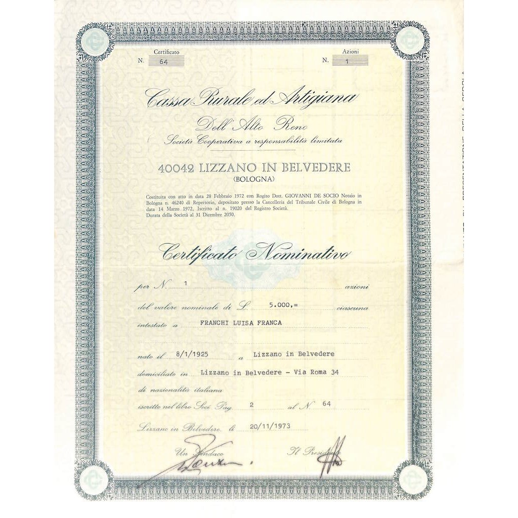 CERTIFICATO NOMINATIVO PER UNA AZIONE