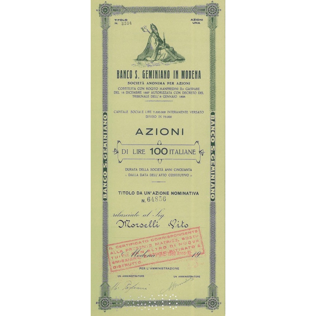 1932 - BANCO DI SAN GEMINIANO IN MODENA 1 AZIONE MODENA