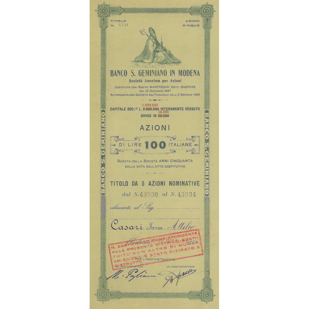 Il Banco S. Geminiano in Modena fu una delle principali istituzioni finanziarie della città emiliana, costituita il 18 dicembre 1897 e operativa fino al termine della sua esistenza nel XX secolo. Fondata con lo scopo di sostenere le attività economiche della regione, il Banco giocò un ruolo importante nel panorama finanziario locale, contribuendo al sostegno delle imprese e del settore agricolo. Nel 1932, anno di emissione del titolo raffigurato, l’Italia stava attraversando un periodo di profonde trasformazioni economiche e politiche, guidate dal regime fascista. La crisi economica globale del 1929 aveva provocato uno shock finanziario che si ripercuoteva in tutta Europa, e anche il Banco S. Geminiano dovette affrontare le conseguenze di tale crisi.