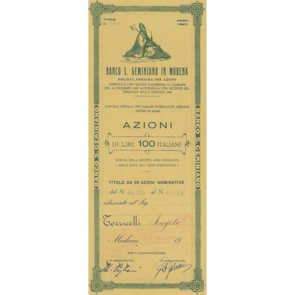 Il Banco S. Geminiano in Modena fu una delle principali istituzioni finanziarie della città emiliana, costituita il 18 dicembre 1897 e operativa fino al termine della sua esistenza nel XX secolo. Fondata con lo scopo di sostenere le attività economiche della regione, il Banco giocò un ruolo importante nel panorama finanziario locale, contribuendo al sostegno delle imprese e del settore agricolo. Nel 1932, anno di emissione del titolo raffigurato, l’Italia stava attraversando un periodo di profonde trasformazioni economiche e politiche, guidate dal regime fascista. La crisi economica globale del 1929 aveva provocato uno shock finanziario che si ripercuoteva in tutta Europa, e anche il Banco S. Geminiano dovette affrontare le conseguenze di tale crisi.