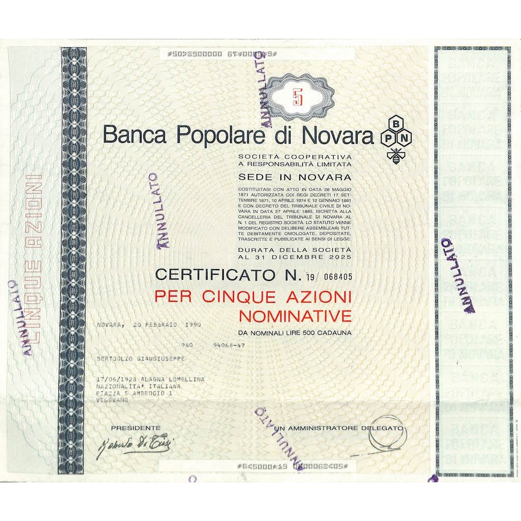 BANCA POPOLARE DI NOVARA - 5 AZIONI NOVARA 1990