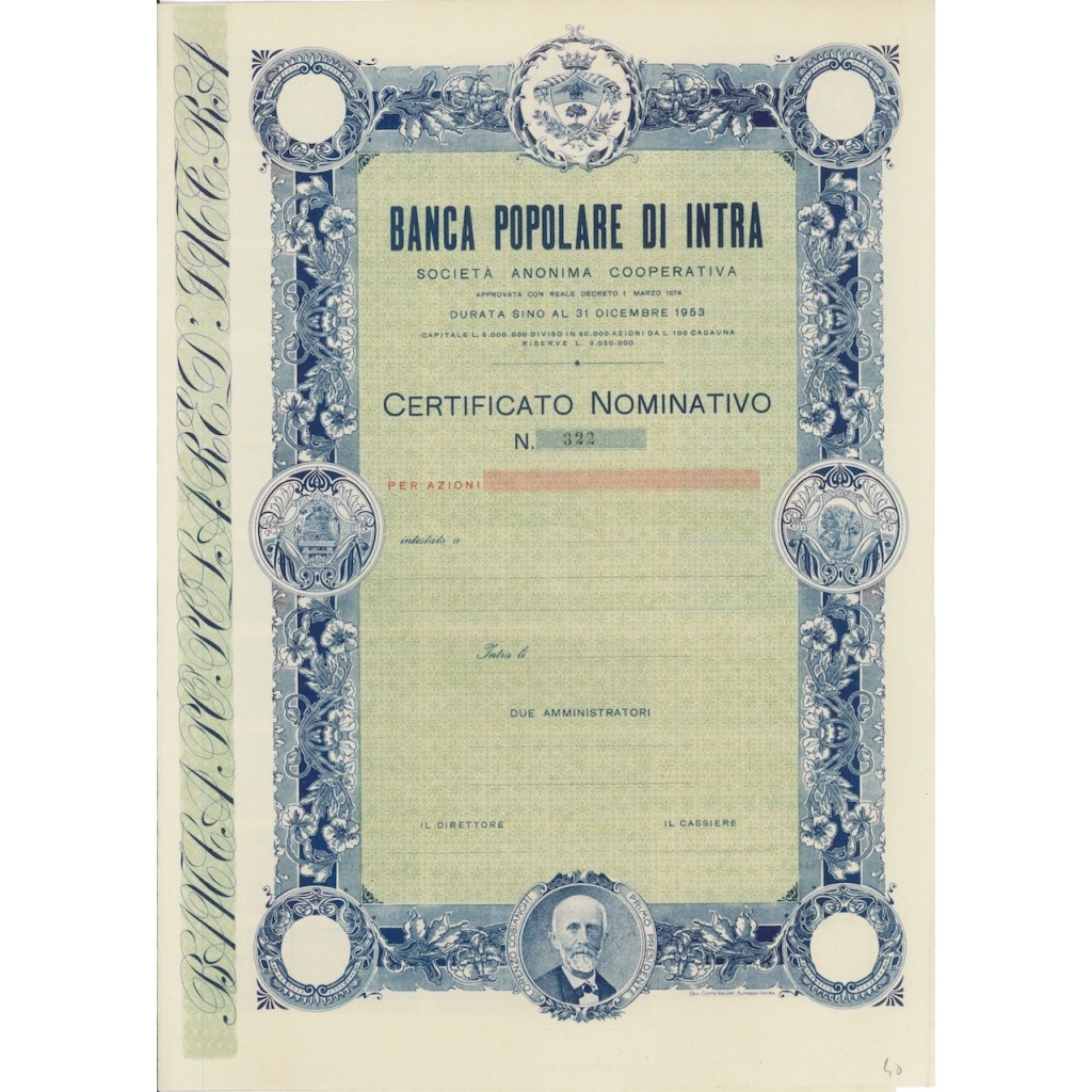 1874 - BANCA POPOLARE DI INTRA - CERTIFICATO NOMINATIVO DI AZIONI - INTRA