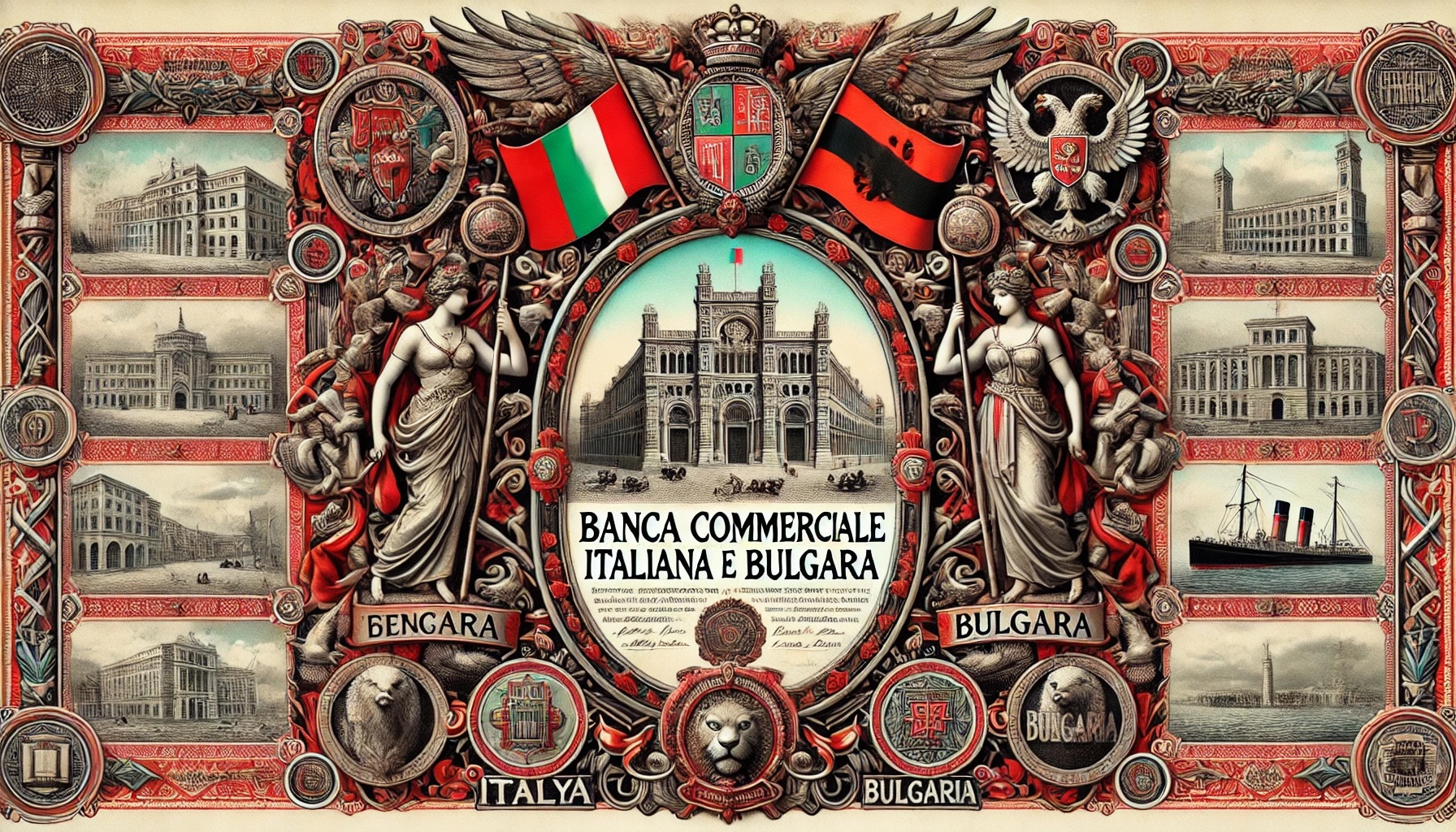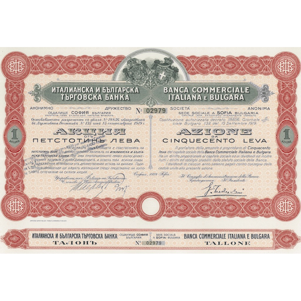 Caratteristiche Visive: Il certificato è decorato con una cornice elaborata in rosso e nero. Al centro superiore, c'è uno stemma con elementi araldici. Il testo è scritto sia in italiano che in bulgaro, riflettendo la natura internazionale della banca. I bordi del certificato sono adornati con motivi decorativi. Nella parte inferiore, è presente un talone per il pagamento dei dividendi.