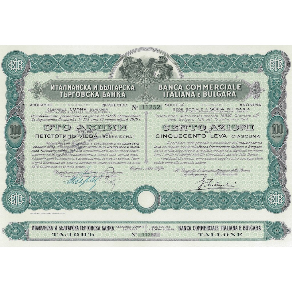 1919 - BANCA COMMERCIALE ITALIANA E BULGARA - 100 AZIONI DA 500 LEVA