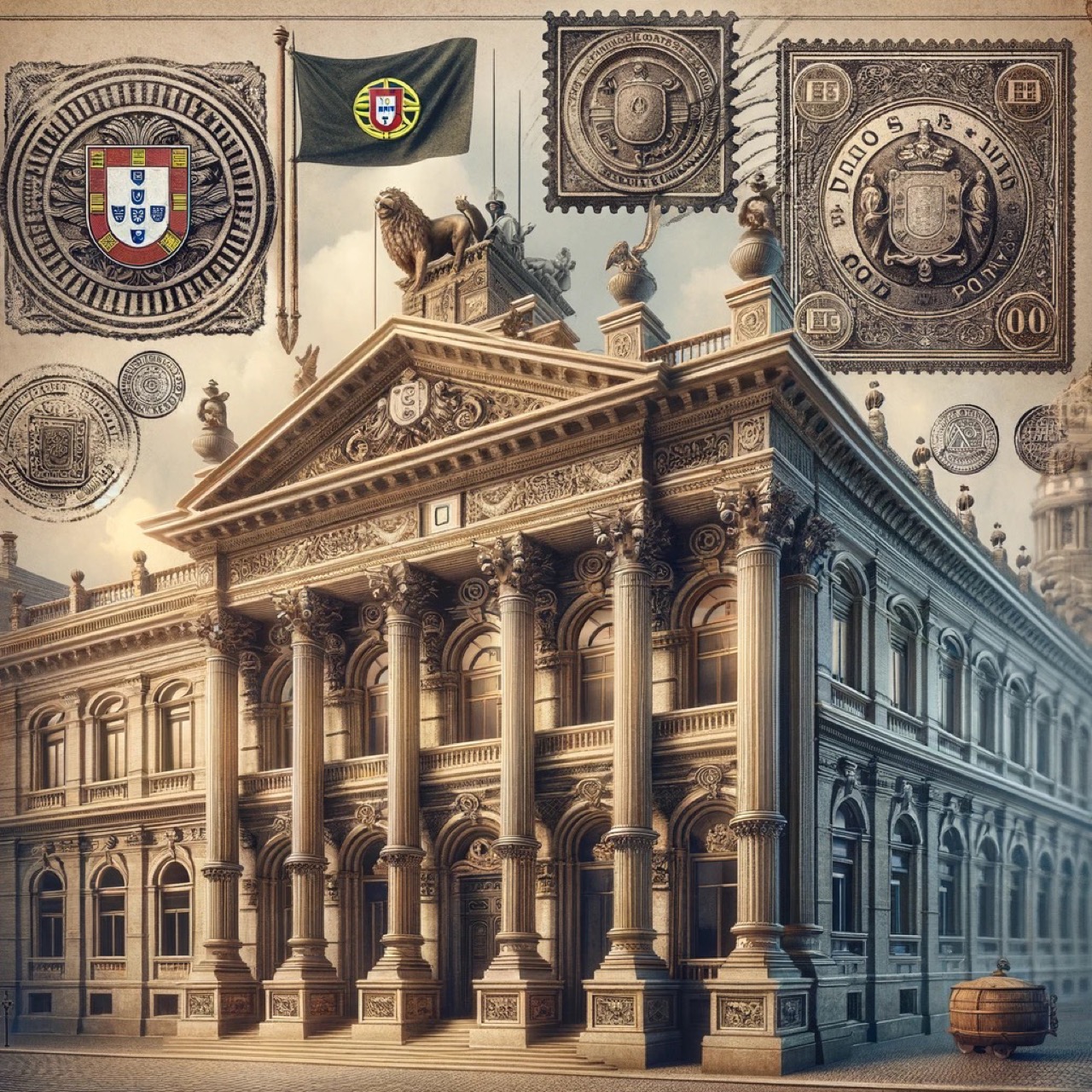 L'immagine rappresenta la scena storica di una banca francese della fine del XIX secolo, con elementi architettonici neoclassici, timbri decorativi e simboli rappresentativi del Portogallo. Questa immagine evoca l'ambiente finanziario industriale e commerciale dell'epoca.