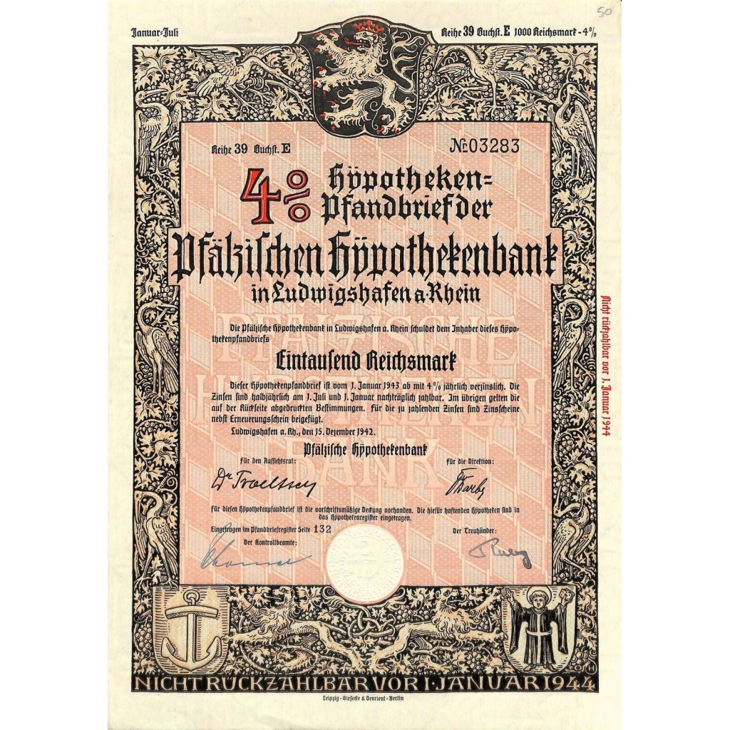 Negli anni '40, quando questo bond ipotecario fu emesso, la Germania stava affrontando significative sfide economiche a causa della Seconda Guerra Mondiale. Nonostante queste difficoltà, la Pfälzische Hypothekenbank ha continuato a fornire servizi finanziari essenziali, contribuendo a mantenere la stabilità nel mercato immobiliare e sostenendo la resilienza economica della regione.