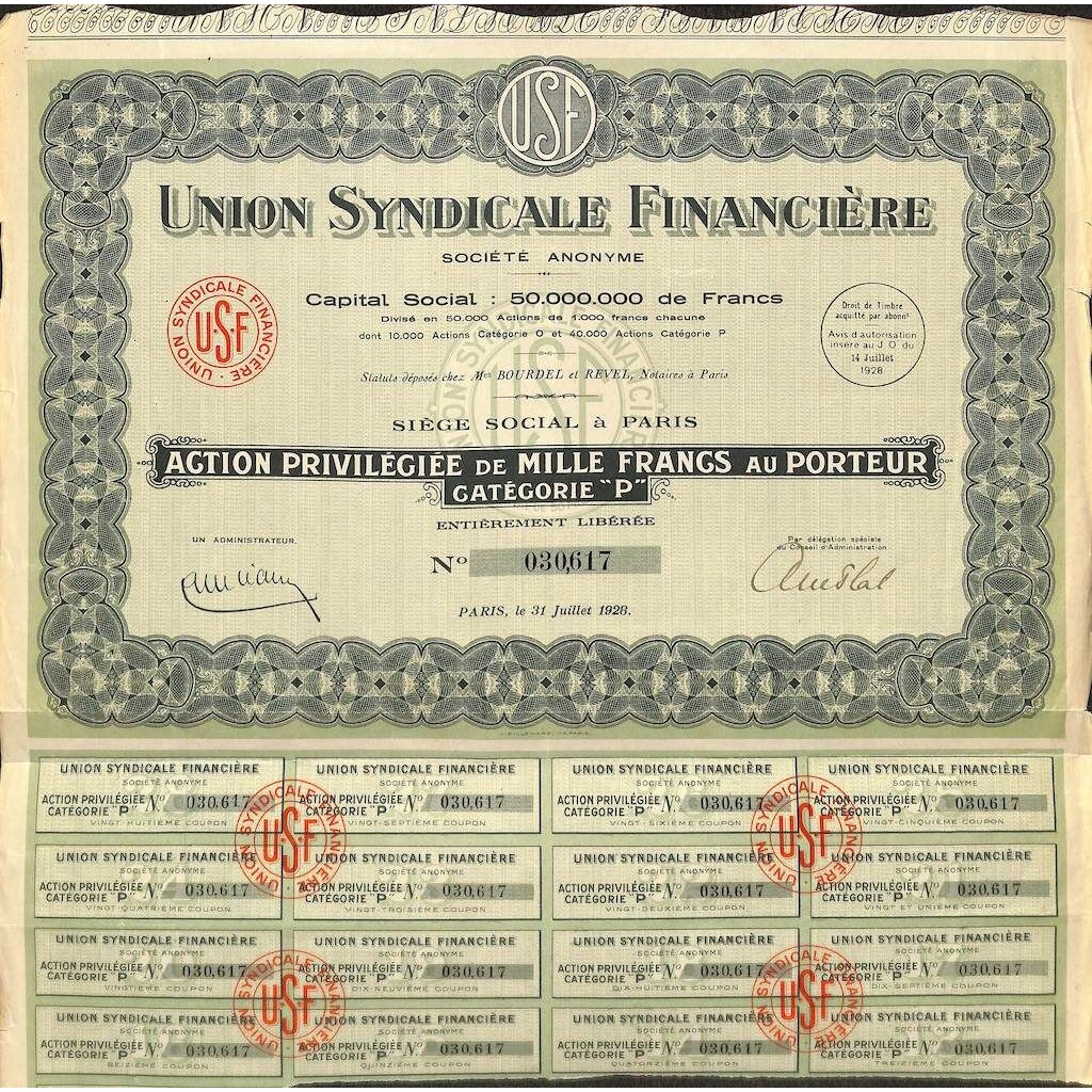Una azione privilegiata al portatore del valore di 1000 Franchi, categoria P.