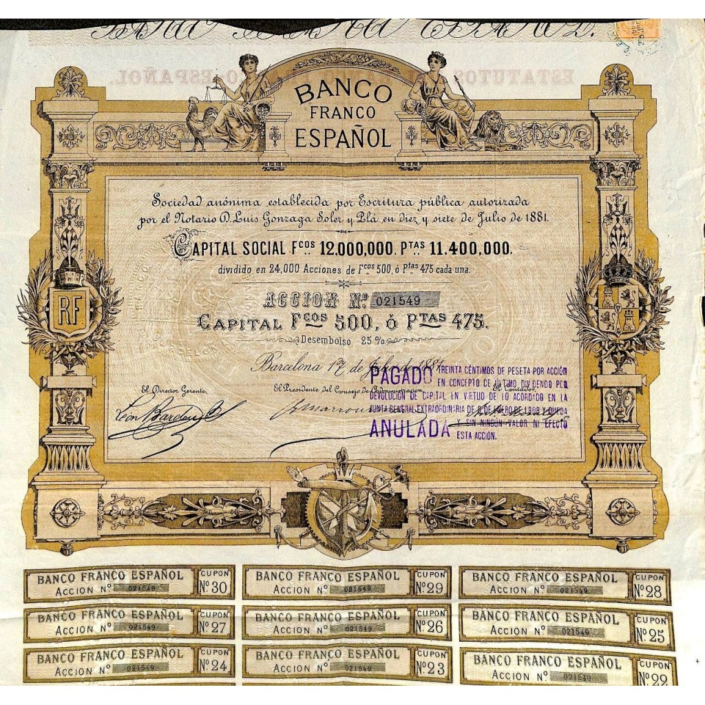 Una azione del valore di 500 Franchi o 475 Pesetas.