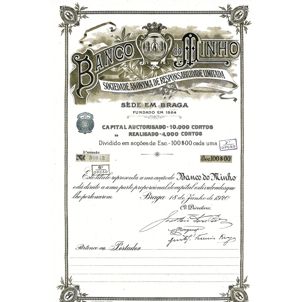 Descrizione Generale: Questa azione storica del Banco do Minho rappresenta un interessante esempio di documentazione finanziaria del passato. Emessa dalla sede principale del banco situata a Braga, questa azione evidenzia la ricca storia bancaria della regione.