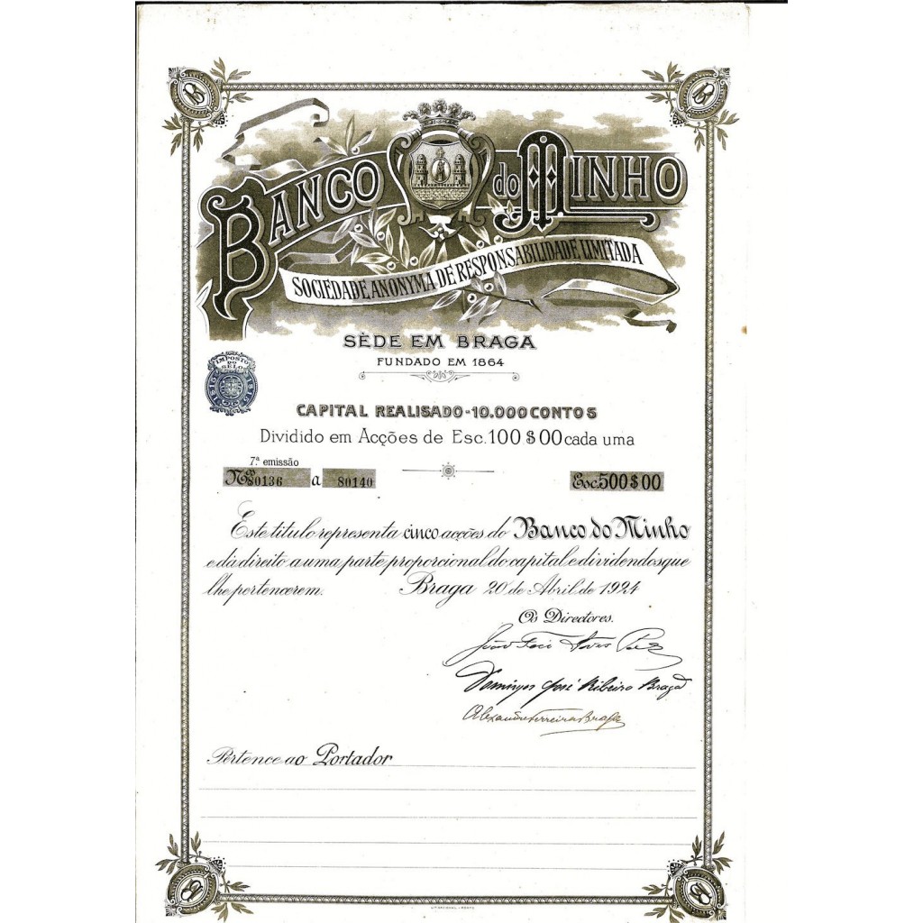 Il Banco do Minho è una società anonima di responsabilità limitata fondata nel 1864 a Braga, una delle città storicamente più rilevanti del Portogallo. Questo istituto bancario ha giocato un ruolo cruciale nello sviluppo economico della regione, fornendo servizi finanziari che hanno supportato il commercio locale e le iniziative imprenditoriali. Il certificato di azioni, emesso nel 1924, rappresenta una quota di partecipazione proporzionale nel capitale del banco.