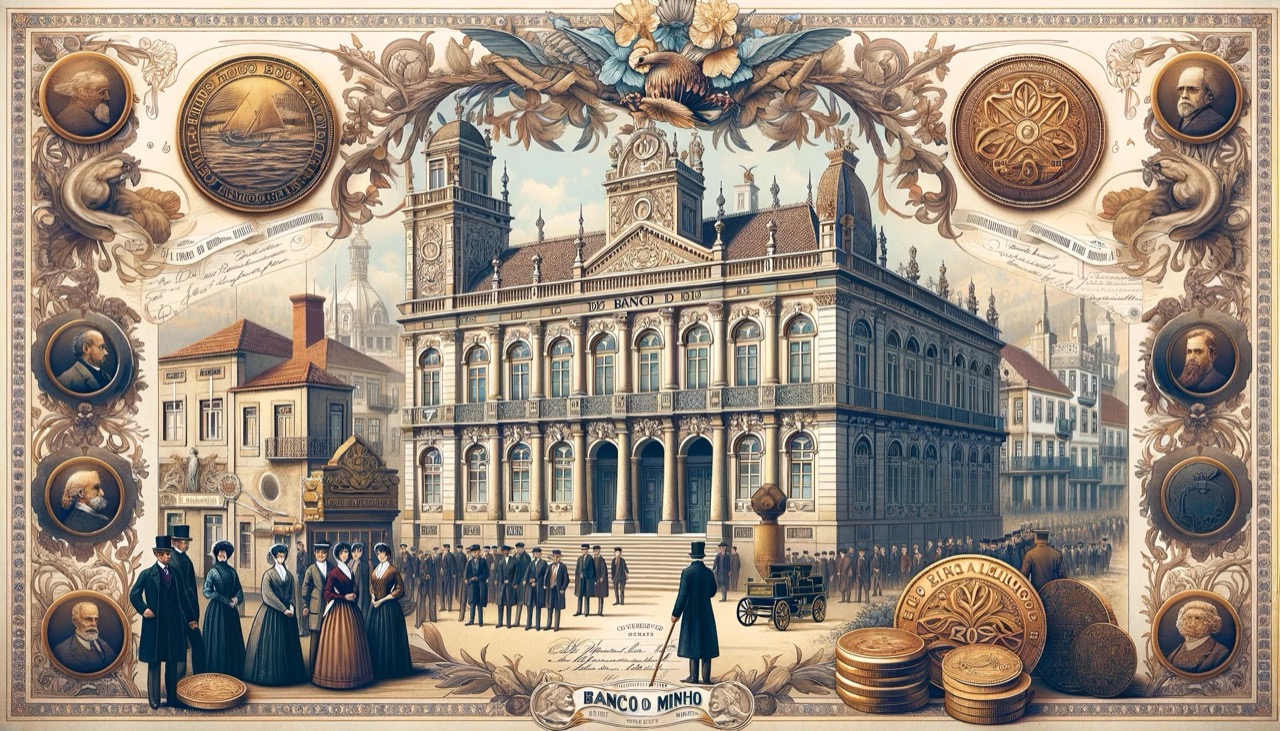 Immagine rappresentativa del periodo con una scena storica di Braga e elementi che richiamano il periodo di fondazione della banca.