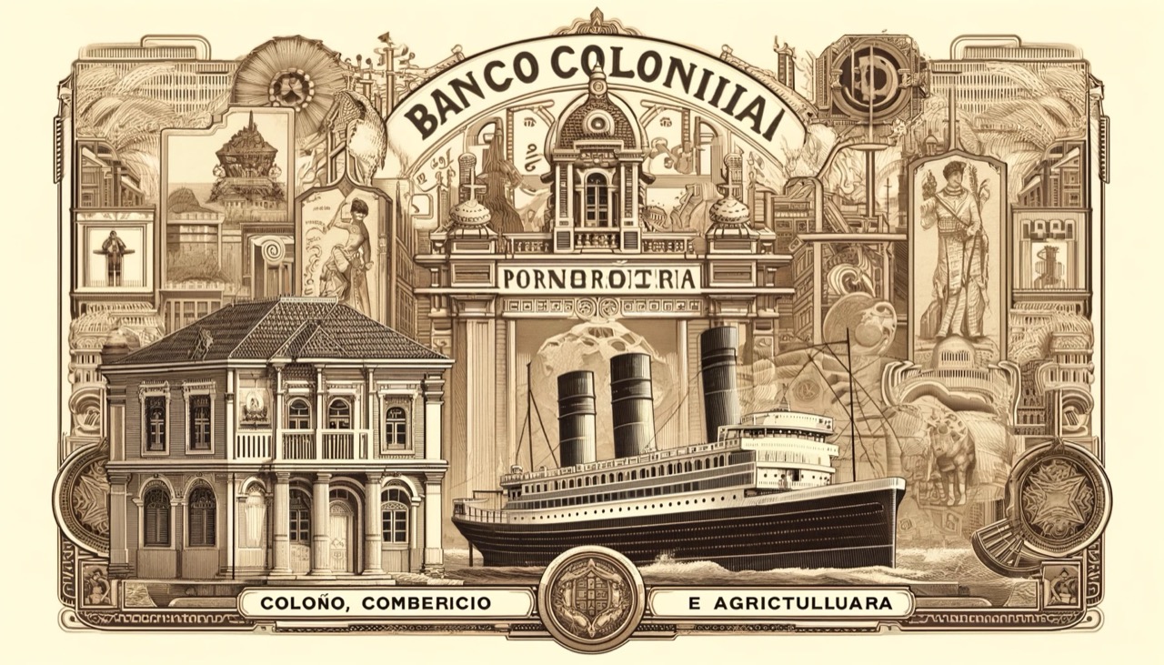 Immagine rappresentativa del Banco Colonial Portuguez. Nell'immagine si vede un edificio coloniale antico con elementi architettonici portoghesi, un vascello a vapore con l'iscrizione "Banco Colonial Portuguez" e "Colónias, Comércio e Agricultura" sotto di esso. Sullo sfondo, ci sono elementi che rappresentano le varie colonie portoghesi, come l'architettura asiatica e africana, simboli di diverse valute e un globo stilizzato che simboleggia la rete internazionale della banca.