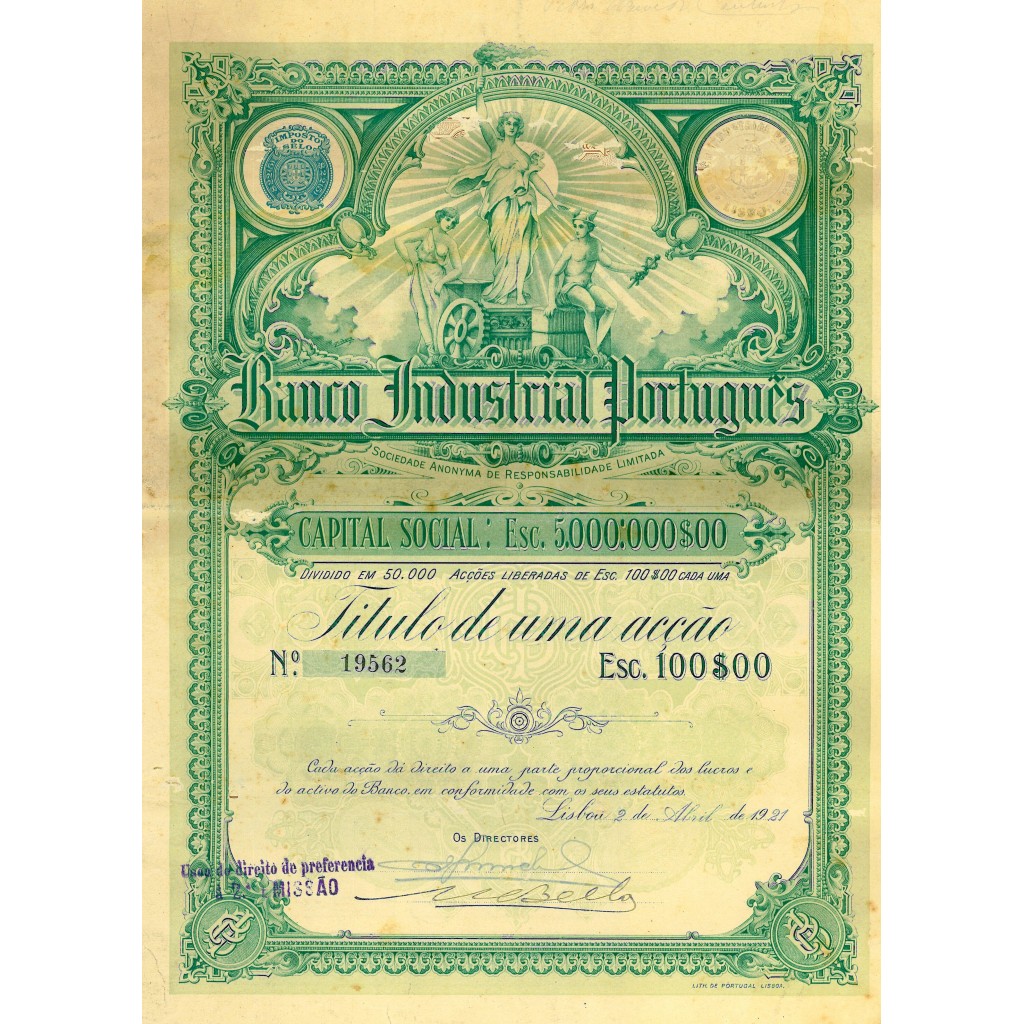 L'immagine rappresentativa per il Banco Industrial Português riflette i temi del progresso, dell'industria e della prosperità, incorporando elementi come la figura allegorica alata, ingranaggi industriali e l'architettura storica portoghese.