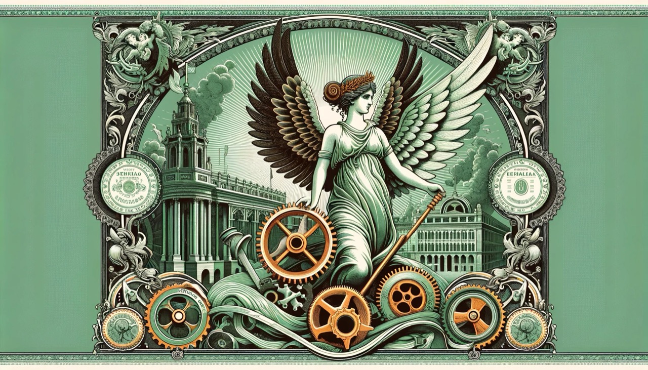 - Iconografia Centrale: Una figura femminile alata, simbolo di progresso e prosperità, accompagnata da una ruota dentata che rappresenta l'industria.