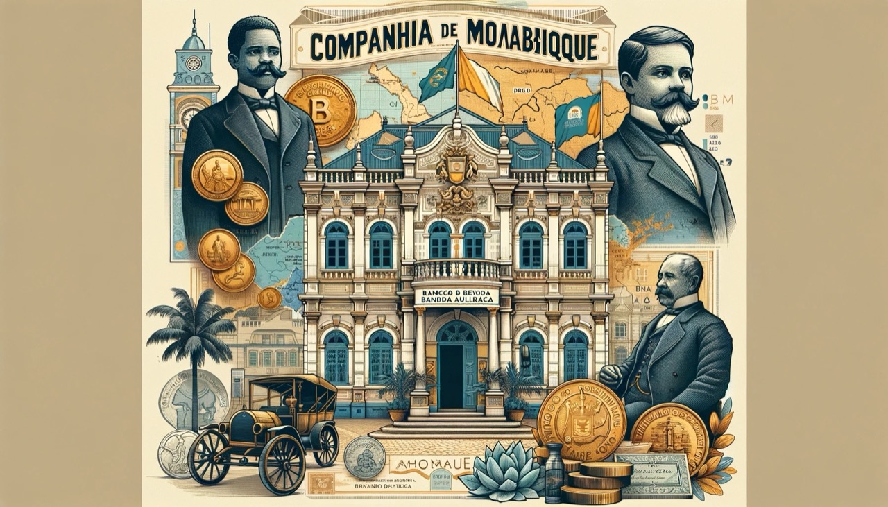 L'immagine  rappresenta la Compagnia del Mozambico. Include elementi significativi come l'edificio in stile coloniale che rappresenta la sede a Beira, simboli finanziari come monete e banconote del Banco da Beira, una mappa storica delle province di Manica e Sofala, e figure stilizzate dei principali dirigenti Manuel Rafael Gorjão Henriques e António Eduardo de Sousa Azevedo Vilaça. Questa rappresentazione cattura l'eleganza e i dettagli dell'epoca coloniale di fine XIX e inizio XX secolo.