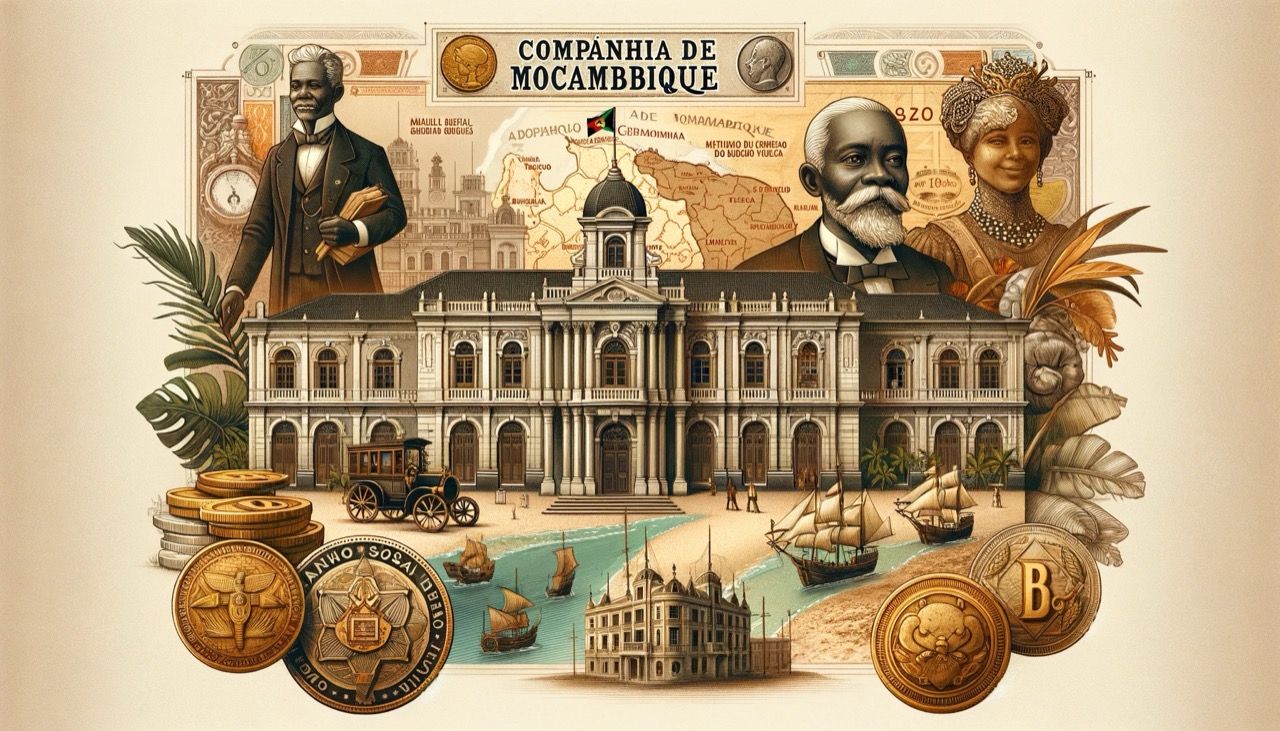 L'immagine storica rappresenta la Compagnia del Mozambico, con elementi chiave come l'edificio in stile coloniale di Beira, simboli finanziari come monete e banconote del Banco da Beira, una mappa storica delle province di Manica e Sofala, e figure stilizzate dei principali dirigenti Manuel Rafael Gorjão Henriques e António Eduardo de Sousa Azevedo Vilaça. Questa composizione cattura l'eleganza e i dettagli dell'epoca coloniale di fine XIX e inizio XX secolo.