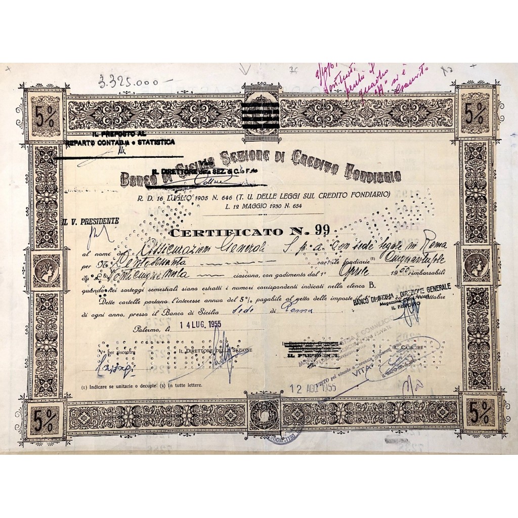 1955 BANCO DI SICILIA (STEMMA SABAUDO) SEZIONE DI CREDITO FONDIARIO 5% - PALERMO