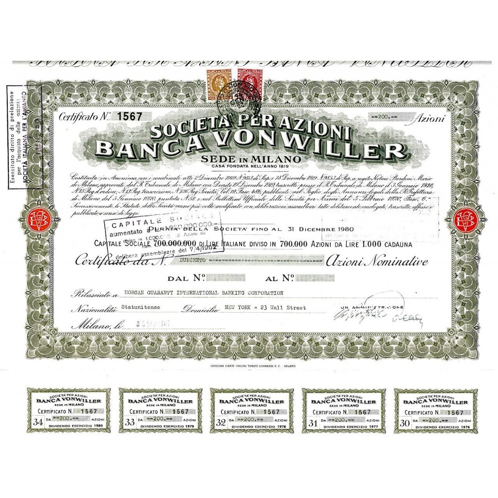 La Banca Vonwiller, fondata nel 1819, rappresenta una delle banche storiche di Milano, nata per soddisfare le esigenze finanziarie di un’epoca di crescita industriale e commerciale. Durante la seconda metà del XX secolo, l’istituto ha consolidato il suo ruolo di intermediario finanziario internazionale, come evidenziato dalla partecipazione di investitori stranieri come Morgan Guaranty.