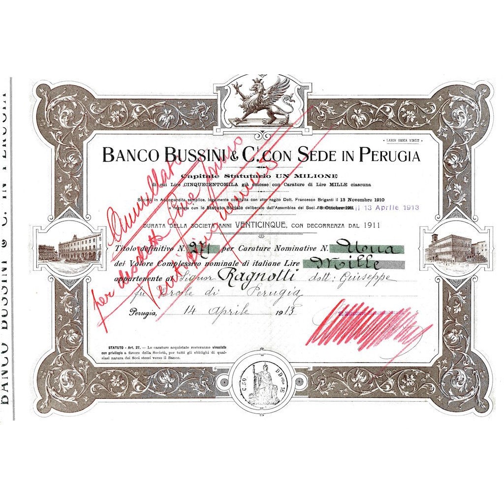Titolo definitivo cumulativo di 271 carature nominative - ovvero quote di una società in accomandita semplice - da 1.000 Lire cad. Perugia 14 aprile 1913. Dicitura trasversale “Annullata per recesso” apposta a mano. Bordo fregiato, grifo araldico in alto e scorci di edifici medievali del centro cittadino fra cui il Palazzo dei Priori dalle grandiose bifore e la grande Fontana di Piazza con sculture di Nicola e Giovanni Pisano.