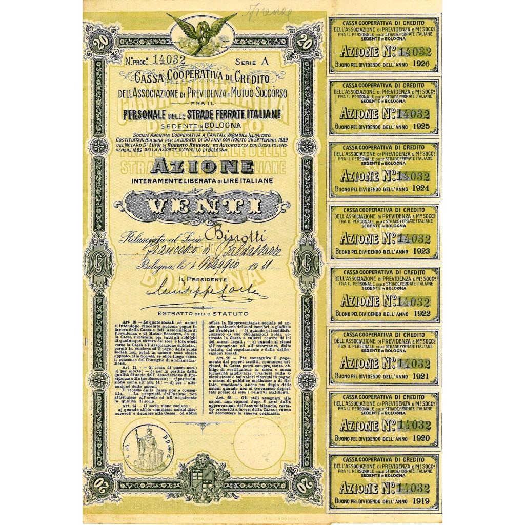 Azione interamente liberata di Lire Italiane 20. Emessa a Bologna il 1 Maggio 1911. La società è stata costituita in Bologna il 26 settembre 1889